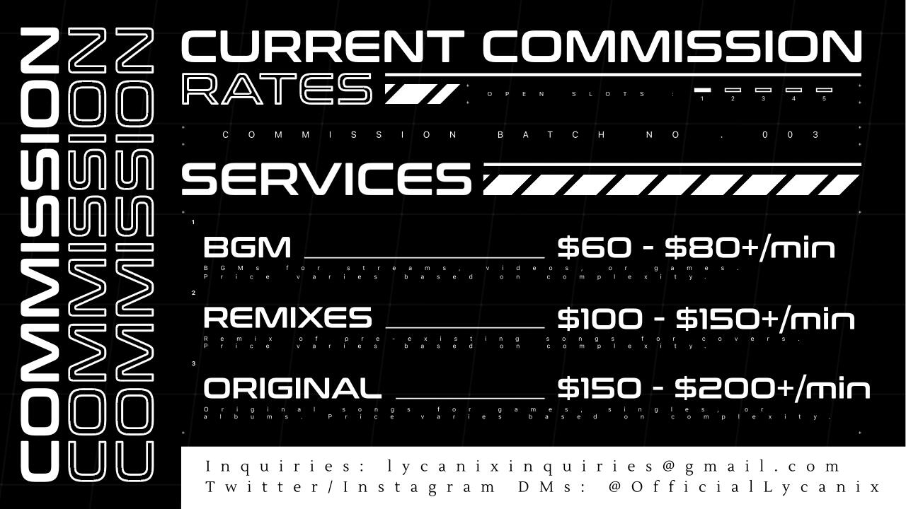 I take references in the form of YouTube links, Discord audio files, and/or MIDI files, and will use the reference material as ideas for the project. I reserve my creative freedom to work on the project with my aspirations and ideas following the client's prompt unless the client asks to imitate a certain element, which I will try to recreate as best as I can.